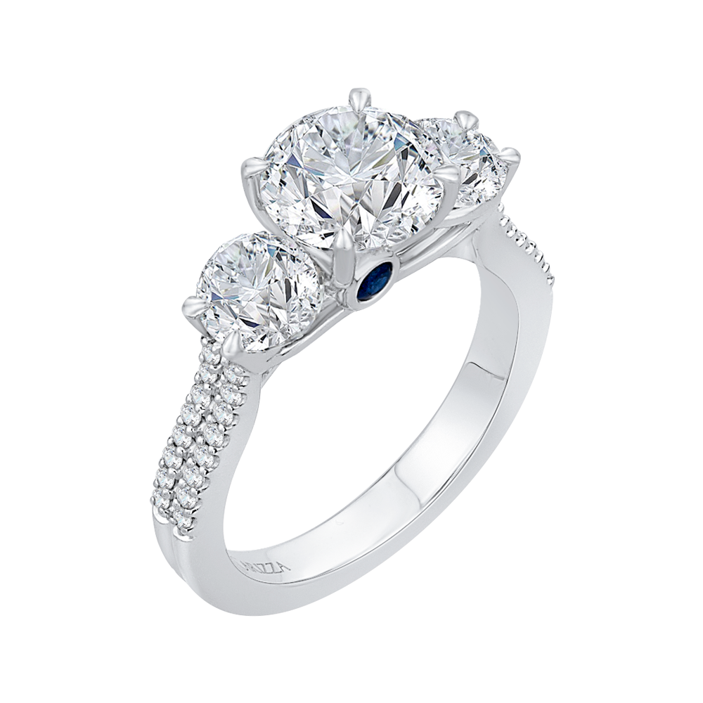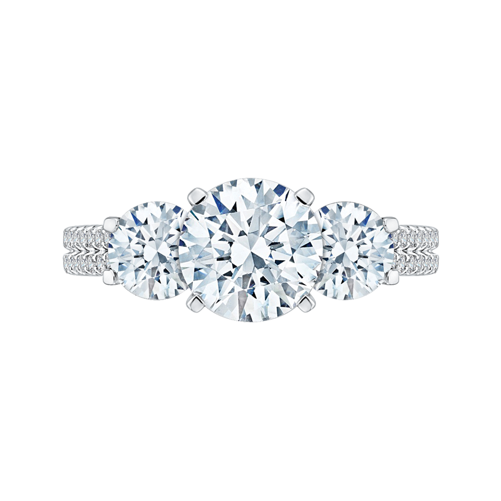 This exquisite diamond three-stone engagement ring features a classic cathedral setting in 14K white gold, creating a timeless and elegant look. The semi-mount design allows you to choose the perfect center diamond to complete this stunning piece. A symbol of past, present, and future love, this ring is the perfect choice for a sophisticated and romantic proposal.