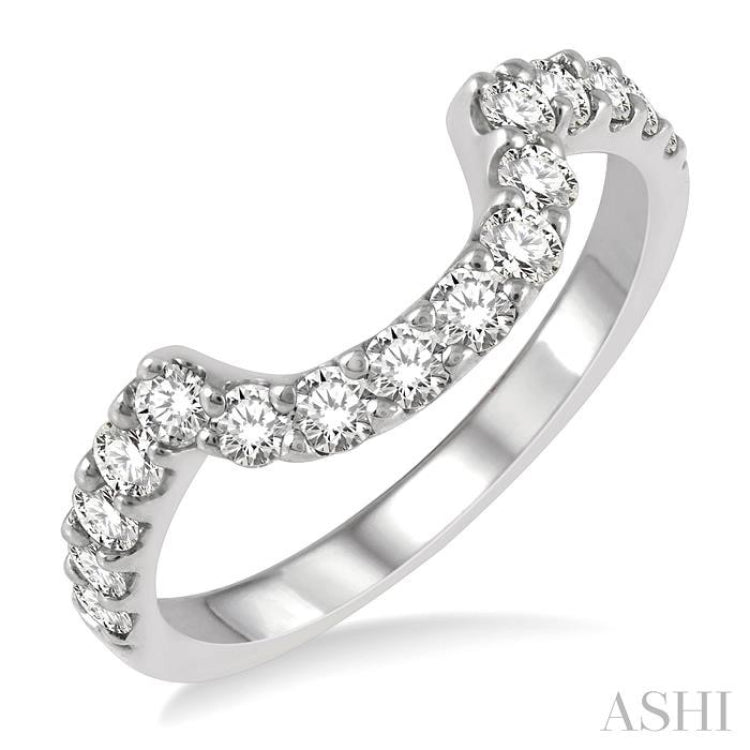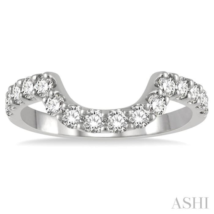 Symbolize the strong bond of love you share with this alluring diamond wedding band. Featuring 16 marvelous round cut diamonds in a brilliant row, elegantly prong set to perfection on the glistening 14 karat white gold. Total diamond weight is 5/8 ctw.