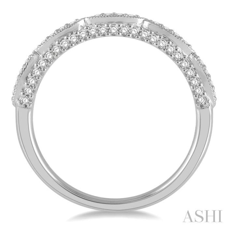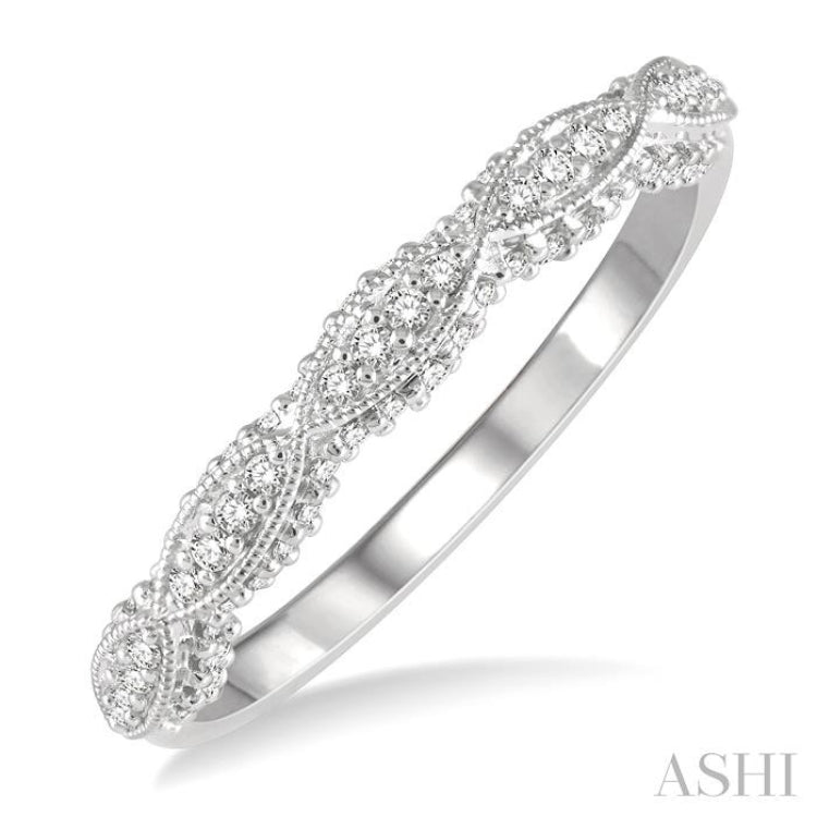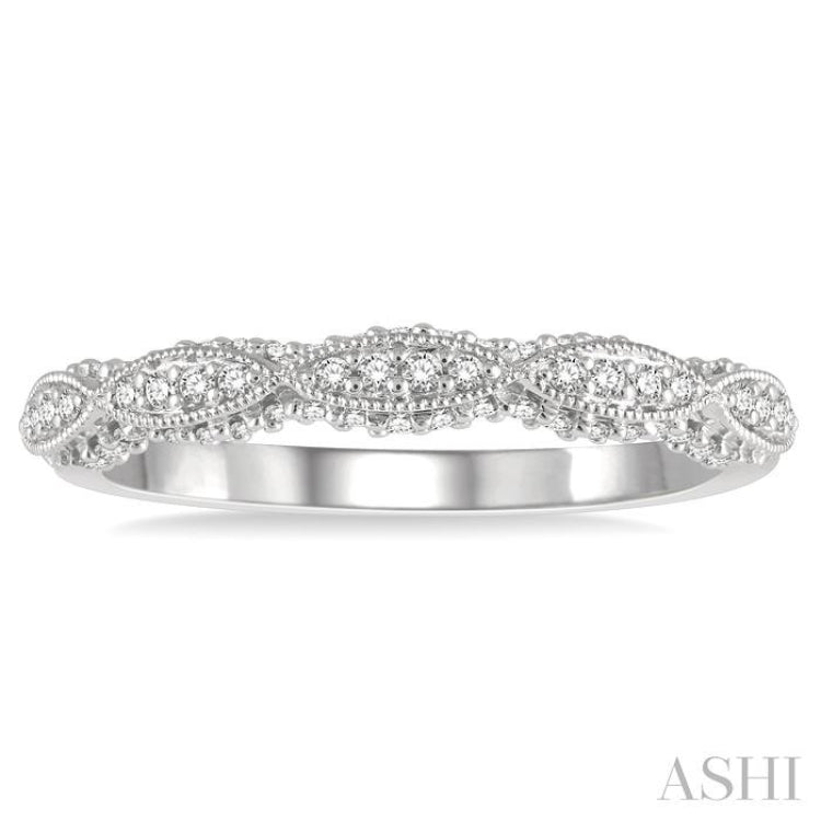 An eye-catching layout diamond wedding band, this offers style and beauty. It features 5 marquise mounts connecting in a neat row at the ring top. Each of these mounts is embellished with 4 each prong set round cut diamonds, total 20. Apart from this, diamonds also decorate the sides of the ring. The are a total of 50 prong set round cut diamonds adorning the sides, 25 each at the front and the back. A milgrain finish is seen bordering the marquise mounts. The diamond wedding band is styled in a polished finish 14 karat white gold. Total diamond weight is 1/3 ctw.