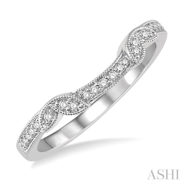 Accentuate your style with our vintage inspired diamond wedding band. Crafted to perfection in enduring 14 Karat White Gold, it features 22 pave-set diamonds with leaf motifs and milgrain finish. Complete your engagement ring or wear it alone, this splendid band makes a wonderful accessory. Total diamond weight is 1/10 Ctw.