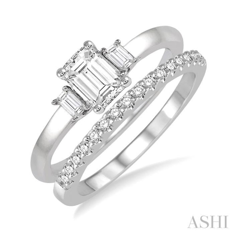 3/4 ctw Diamond Wedding Set With 5/8 ctw Octagonal & Baguette Engagement Ring and 1/8 ctw Round Cut Diamond Wedding Band in 14K White Gold