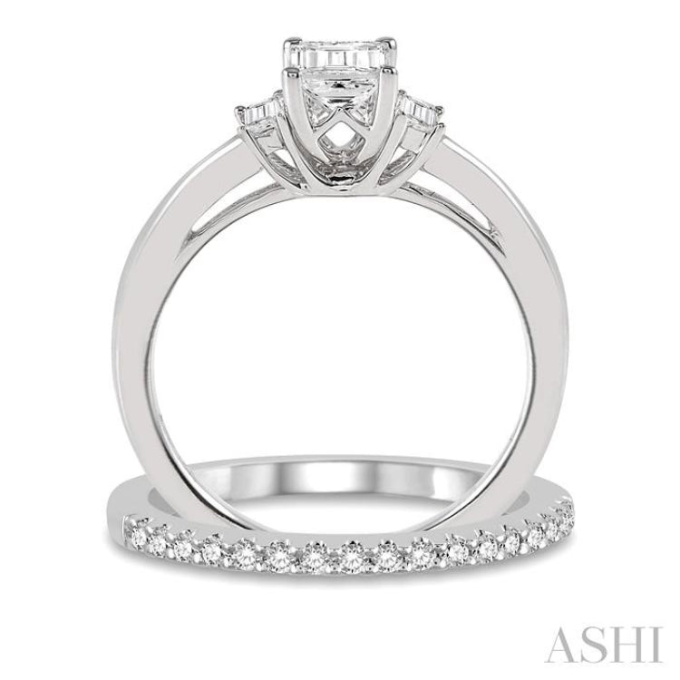 A sleek and stylish diamond wedding set, this offers appeal to young couples. It features a simple but sophisticated design that is beautiful and a quick choice. The 5/8 ctw engagement ring displays a raised centerpiece, with a 1/2 ctw prong set octagonal cut center stone. This is flanked by a prong set baguette diamond each, placed on a lower border on either side. The shank is plain white gold. Keeping the simple look, the wedding band offers a straightforward design. It is encrusted with 30 micro wall set round cut diamonds that form a neat row. The bridal set is styled in a polished finish 14 karat white gold. Total diamond weight is 3/4 ctw.