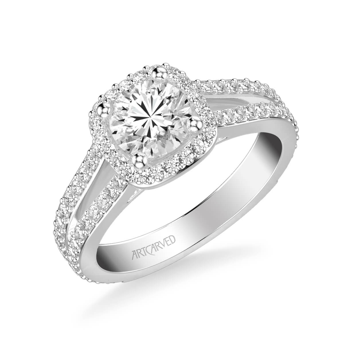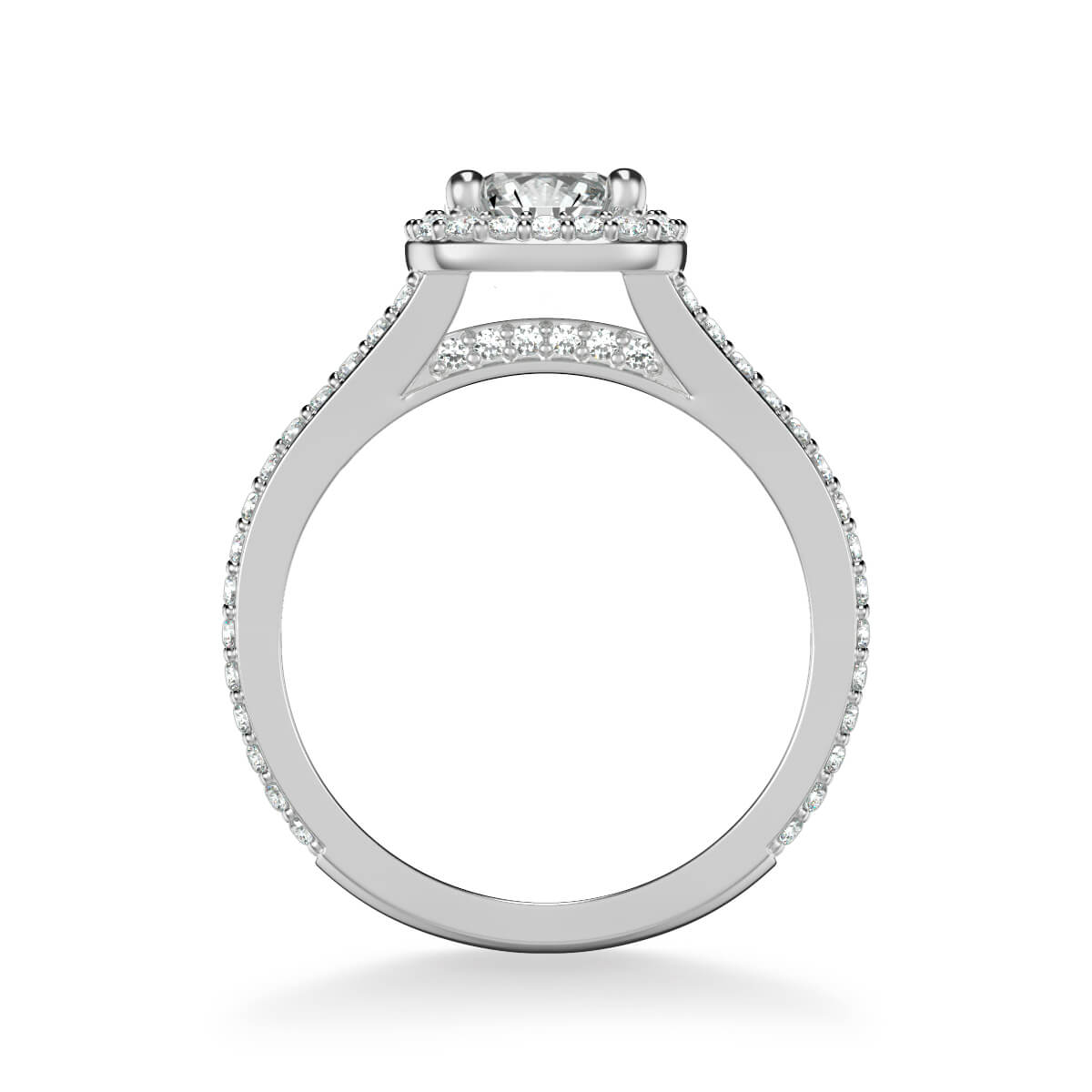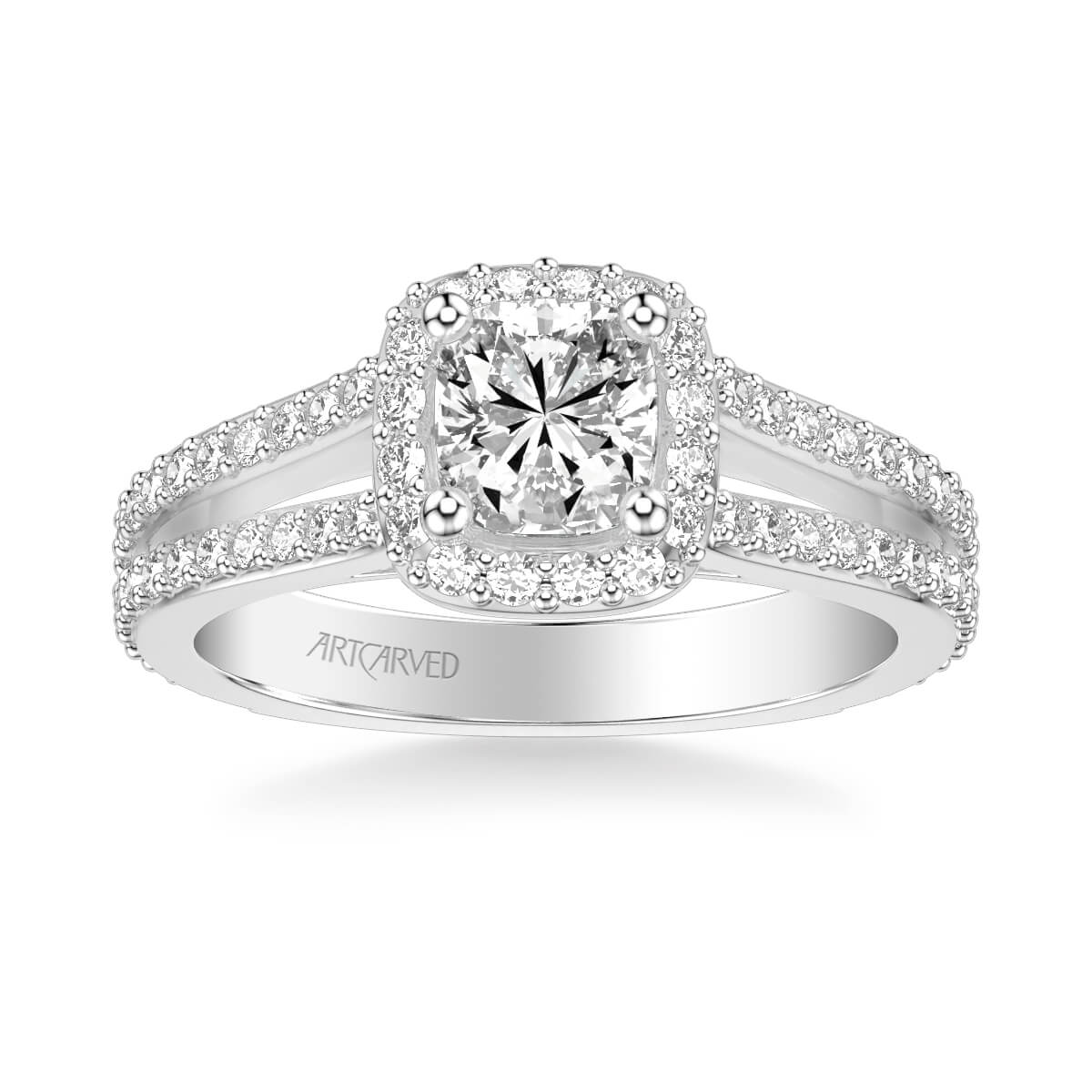 This Halo Diamond Engagement Ring checks all the boxes. With a cushion shape diamond halo and a split row diamond band, this ring doubles up on the sparkle with diamonds galore.