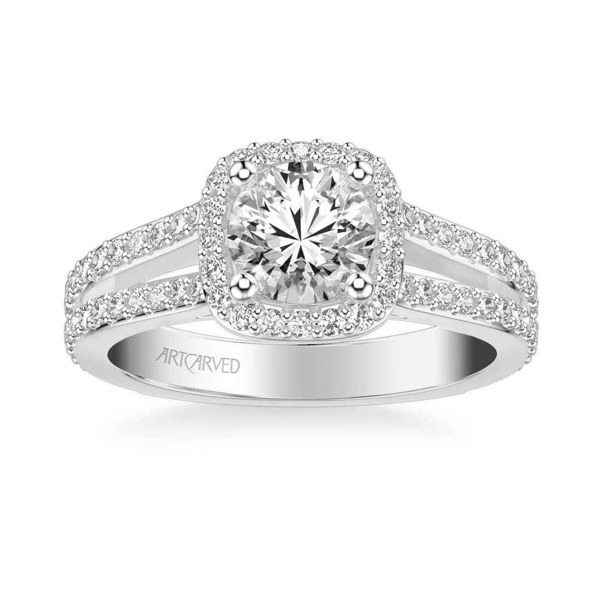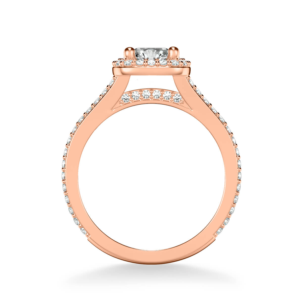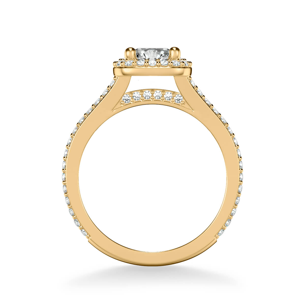 This Halo Diamond Engagement Ring checks all the boxes. With a cushion shape diamond halo and a split row diamond band, this ring doubles up on the sparkle with diamonds galore.