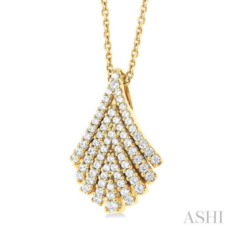 The fan is symbolic of wealth and status in traditional Chinese culture. It also signifies, love, power and etiquette. This diamond fAshion pendant is an attractive choice, be it for its symbolism or its showy look. It features a half-open hand fan shape, with round cut diamonds decorating it. There is a total of 68 prong hand set round cut diamonds embellishing the opening flaps of the fan pendant, starting with 22 on the outermost flaps, followed by 17, 15, 11, and ending with 3 on the innermost flap. A Chain25 comes included for the pendant. Both chain and diamond fAshion pendant are carved in 14 karat yellow gold. Total diamond weight is 1/3 ctw.