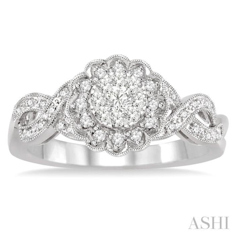 A beautifully carved Lovebright diamond engagement ring, this showcases attractive craftsmanship. It features a center mount held above a split twisted shank. The top border of the floral centerpiece displays 9 invisible set round cut diamonds, 1 in the center and 8 encircling it. Bordering the top border is a floral lattice work lower tier that is decorated with 12 pave set round cut diamonds. 10 each pave set round cut diamonds adorn the split crisscross shank on either side. A milgrain border highlights the floral centerpiece and the split crisscross shank. The engagement ring is crafted in 14 karat white gold. Total diamond weight is 1/3 ctw.