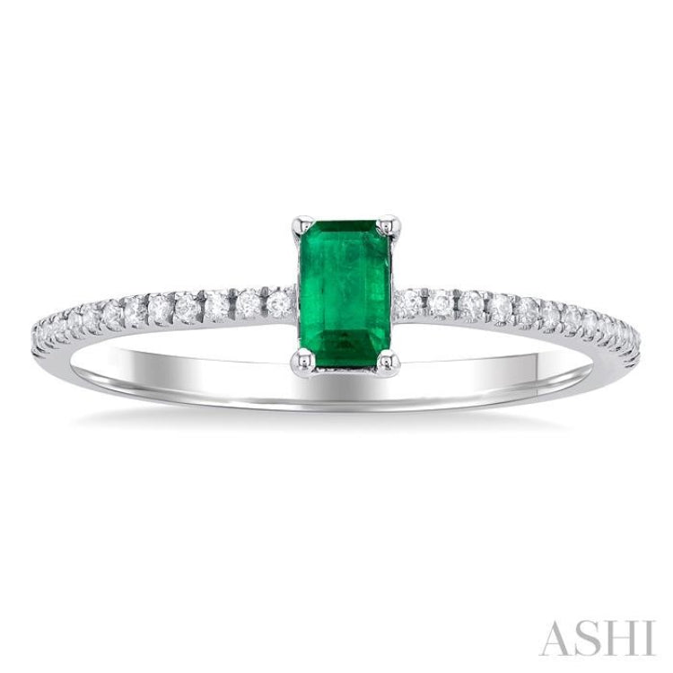 An alluring precious gemstone fAshion ring, this can add elegance to your looks. It comes from the petite collection, an assemblage that has been in hot demand this season. The ring features a prong raised 5X3MM emerald cut Emerald center stone. 13 each, total 26, fishtail set round cut diamonds embellish the slender shank on either side. The Petite precious fAshion ring is styled in a rhodium finish 10 karat white gold. Total diamond weight is 1/10 ctw.