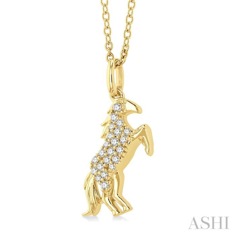 The horse symbolizes freedom, strength, power, and courage. In many cultures, it is worn as a good luck talisman, but it can be worn as a fAshion accessory too. This petite collection diamond horse fAshion pendant features a horse standing up on its hind legs. While plain gold highlights can be seen marking the lower legs, mane, tail, and half the face, the body is embellished with diamonds. There is a total of 22 prong set round cut diamonds accentuating the body. A CAT23 chain carries the Petite horse pendant on a plain gold loop holder. Both diamond fAshion pendant and chain are styled in 10 karat yellow gold. Total diamond weight is 1/8 ctw.