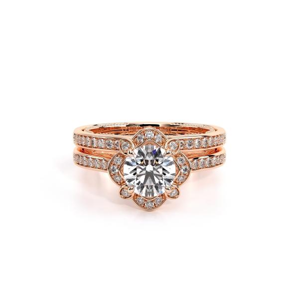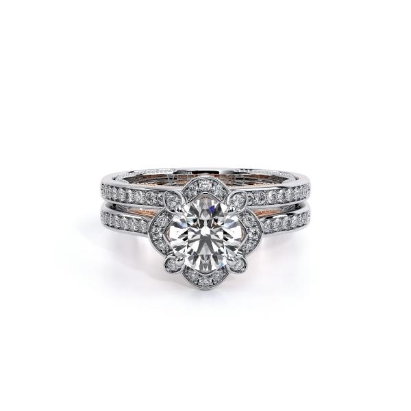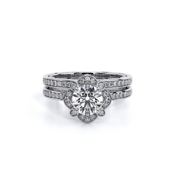 Elevate your engagement with the timeless elegance of the Verragio Women's Engagement Ring with Matching Wedding Band, the INSIGNIA-7094W. This exquisite piece from the INSIGNIA collection features a vintage design with a Fiore diamond halo and intricate scrollwork, crafted to highlight a round diamond center.