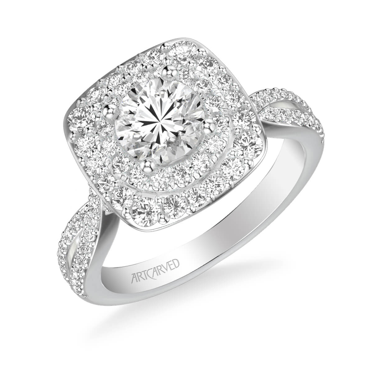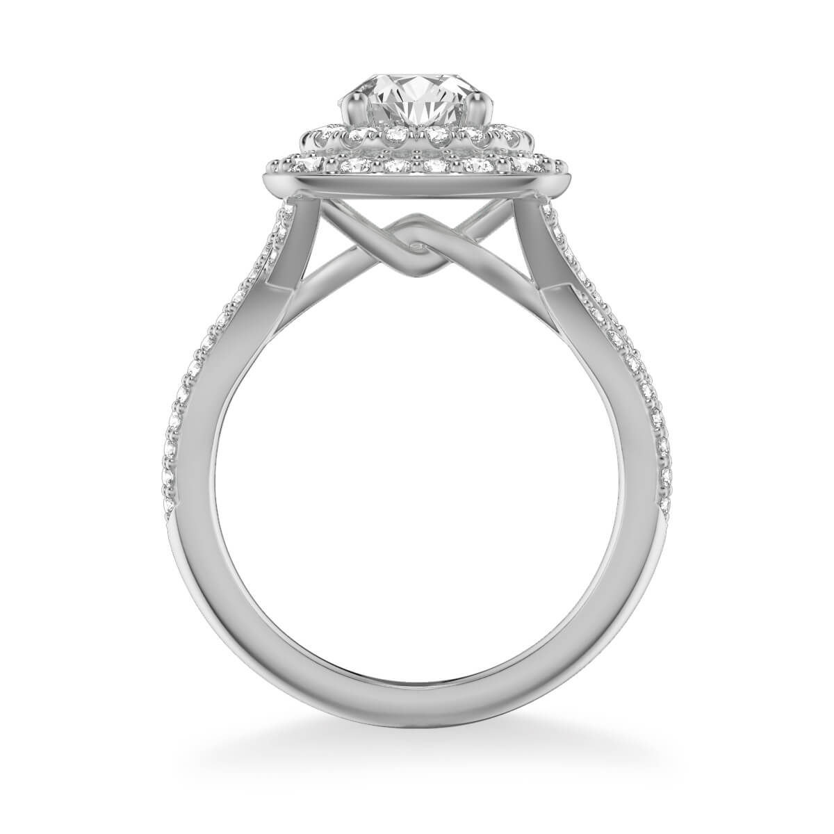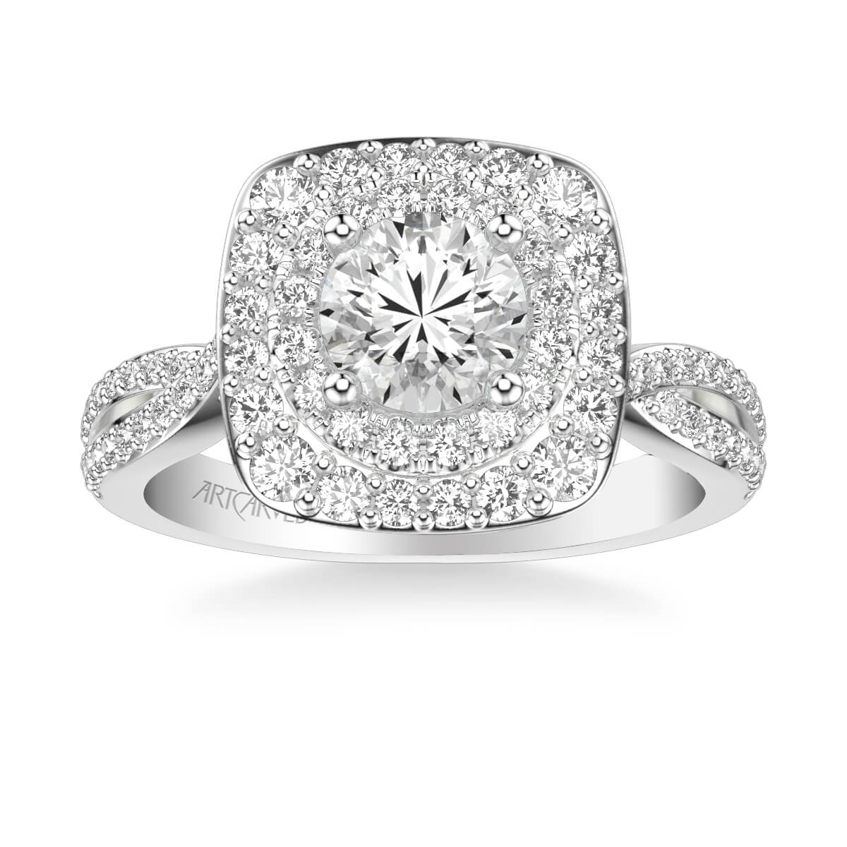This Halo Diamond Engagement Ring is nothing short of spectacular. The cushion and round diamond halos surround the center stone with double the diamonds. The diamond twist band wraps it all up beautifully.