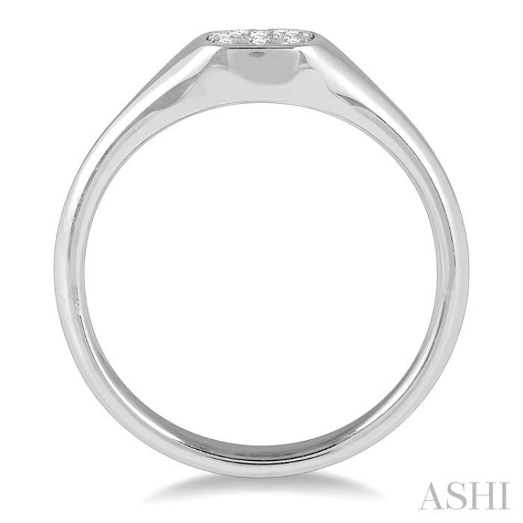 An elegant, no fuss ring, this offers clean contours and a bright inclusion of illuminating round cut diamonds. The Lovebright diamond ring, like all other rings in the collection provides beauty even in its simple form. It features a cushion shape mount, neatly embedded in the center, in the body of the ring. 9 Invisible set round cut diamonds can be seen adorning the mount, with a diamond in the center and smaller ones surrounding it.The rest of the ring is in smooth plain gold, and is styled in 14 karat white gold. Total diamond weight is 1/4 ctw.