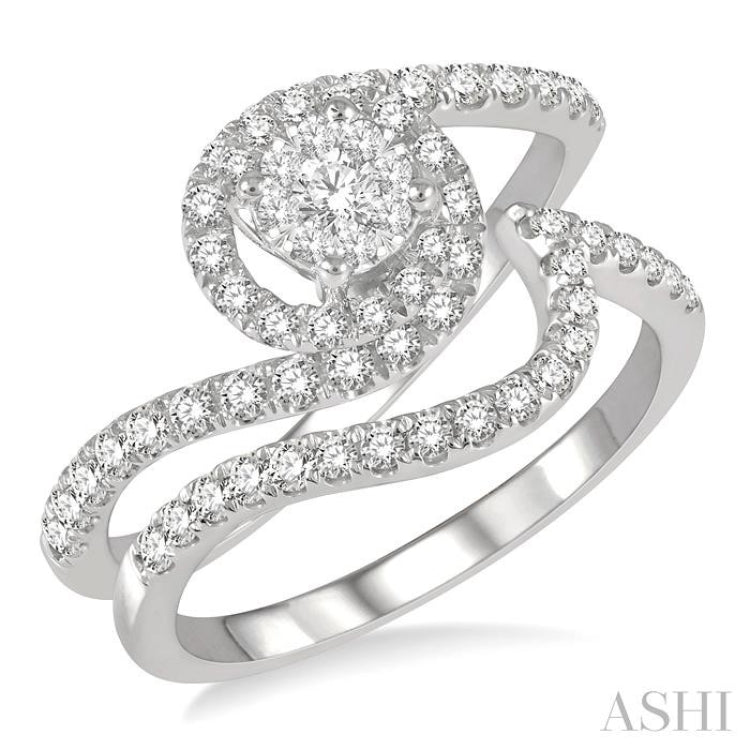 3/4 ctw Lovebright Round Cut Diamond Wedding Set With 1/2 ctw Circular Bypass Engagement Ring and 1/5 ctw Scoop Curve Wedding Band in 14K White Gold