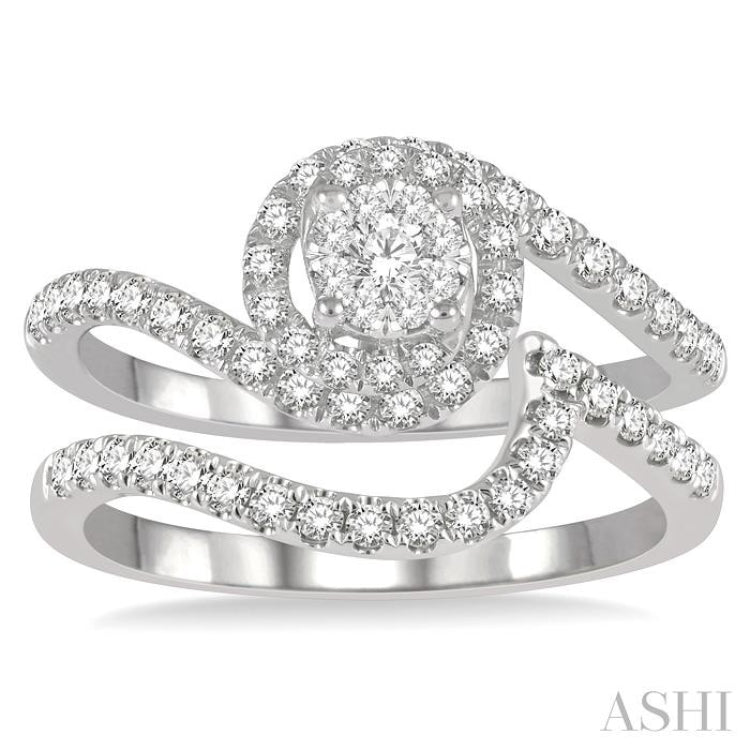 A simple but attractive diamond wedding set, this meets your need for an engagement ring and wedding band in a single package. Since it comes from the Lovebright Collection, it maintains a chic appeal. The set features a 1/2 ctw engagement ring, with a prong-raised circular center mount, held in the embrace of a bypass shank. 9 invisible set round cut diamonds decorate the center mount, 1 in the center and 8 haloing it. The shank is embellished with 19 each, a total of 38, micro wall set round cut diamonds on either side. Fitting smoothly alongside the engagement ring is a 1/5 ctw wedding band, with a scoop curve center offering the perfect shape to slide beside the mount. 20 micro wall set round cut diamonds to adorn the wedding band. The wedding set is styled in 14 karat white gold. Total diamond weight is 3/4 ctw.