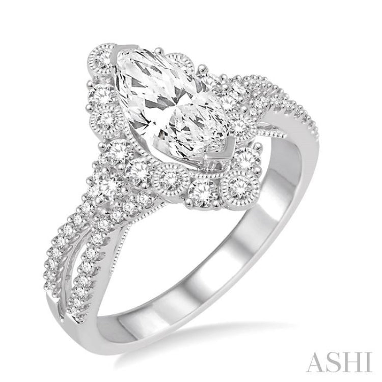 Make a modern and sophisticated statement of love with this remarkable diamond semi-mount ring. FAshioned in luminous 14 karat white gold this milgrain finish ring is calibrated by 60 round cut diamonds that frames a marquise shape further embellishes the collar and lined the split shank in sparkling rows. Diamonds are perfectly set in bezel, pave and prong settings. The crown of this ring is designed to frame your choice of round center stone ranging from 0.55 carat to 0.75 carat. Total diamond weight is 1/2 ctw.