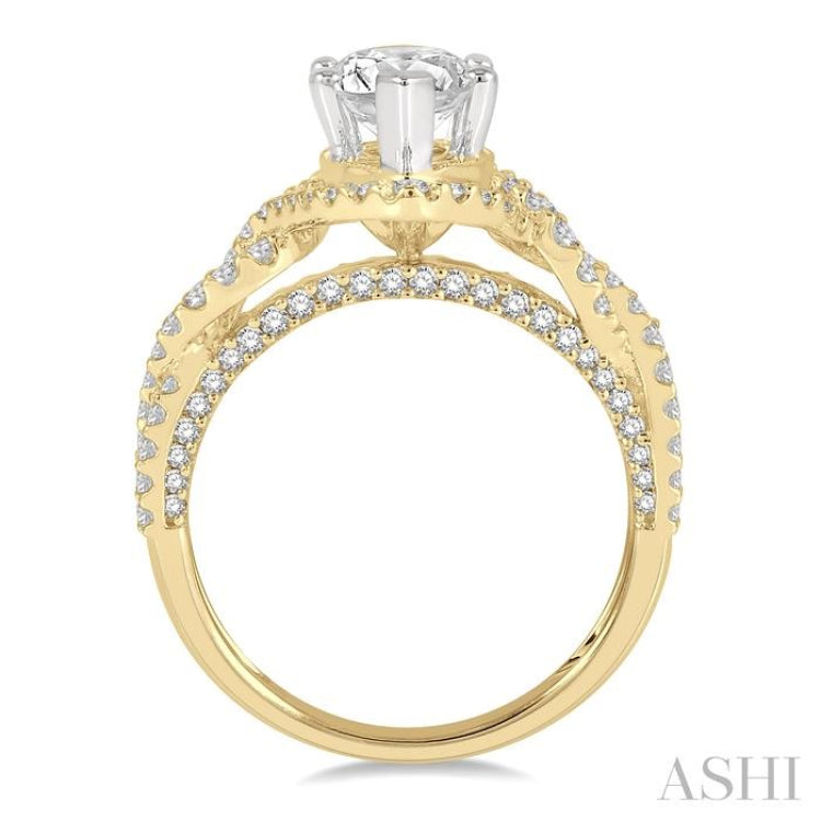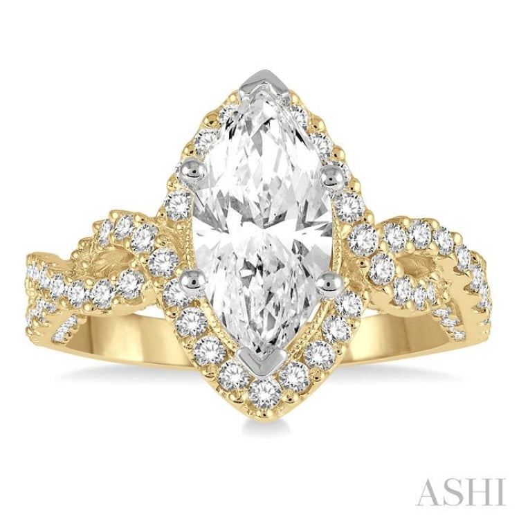 A pleasing semi-mount diamond engagement ring, this lures with its lovely layout and design. It displays a marquise shape border center mount, with a prong lifted middle that is designed to house a center stone of your liking, a feature offered by semi-mount rings. You will need to choose a marquise cut stone, ranging from 1.00 ctw to 1.50 ctw. The entwined split shank extends onto the border mount from both ends, such that it embraces the pronged middle holding the center stone. Total 58 prong set round cut diamonds embellish the split shank and the center mount. In the ring interior, under the gallery, is an arch that is adorned with total 52 half channel prong set round cut diamonds at the front and back together. A milgrain border is seen around the pronged border. The ring is crafted in 14 karat yellow and white gold. Total diamond weight is 3/4 ctw.