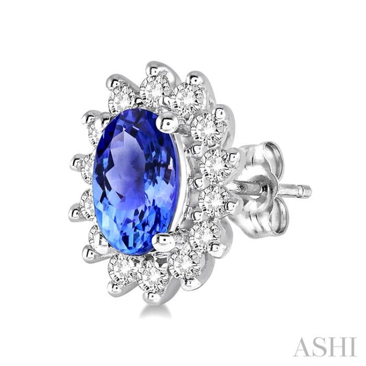 Dressy and attractive, this pair of Tanzanite and diamond earrings makes for an instant attraction. It is eye-catching and elegantly embellished to give you a chic look. The earrings feature a 5x3 MM oval cut Tanzanite center stone each, which is then adorned by 28 prong set round cut diamonds. The glistening diamonds create a sunflower like pattern that gives the earrings great visual appeal. The enchanting studs are sculpted in 10 karat white gold. Total diamond weight is 1/5 ctw.