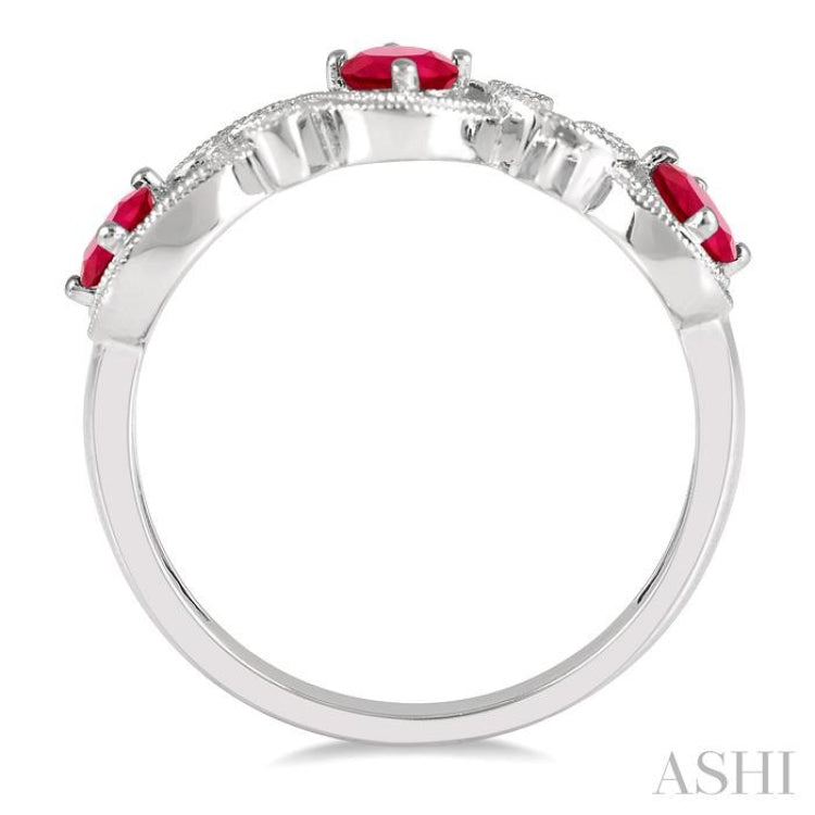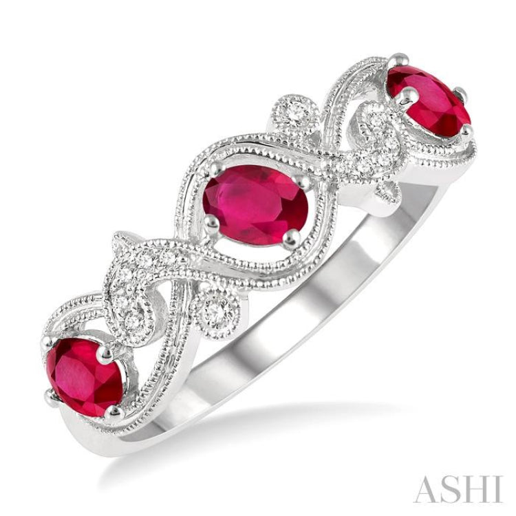 A chic ruby and diamond precious wedding band, this makes for an instant eye-catcher. It is not only beautifully designed, but also offers a unique wedding band look. The ring features a lovely open Lattice entwined top, with glorious oval cut rubies nestled within each open window. There are a total of 3 prong set 4x3MM oval cut rubies embellishing the band. Apart from this, 2 bezel set round cut diamonds and 10 pave hand set round cut diamonds, decorate the entwined top. A milgrain border highlights the Lattice pattern. The precious wedding band is carved in a polished rhodium finish 14 karat white gold. Total diamond weight is 1/20 ctw.