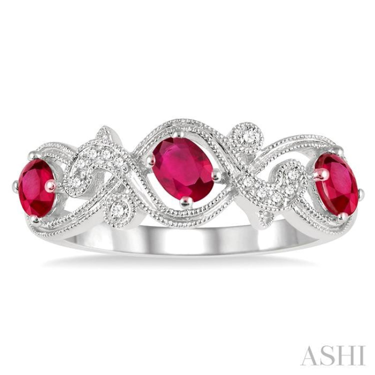 1/20 ctw Entwined Open Lattice 4x3MM Oval Cut Ruby and Round Cut Diamond Precious Wedding Band in 14K White Gold