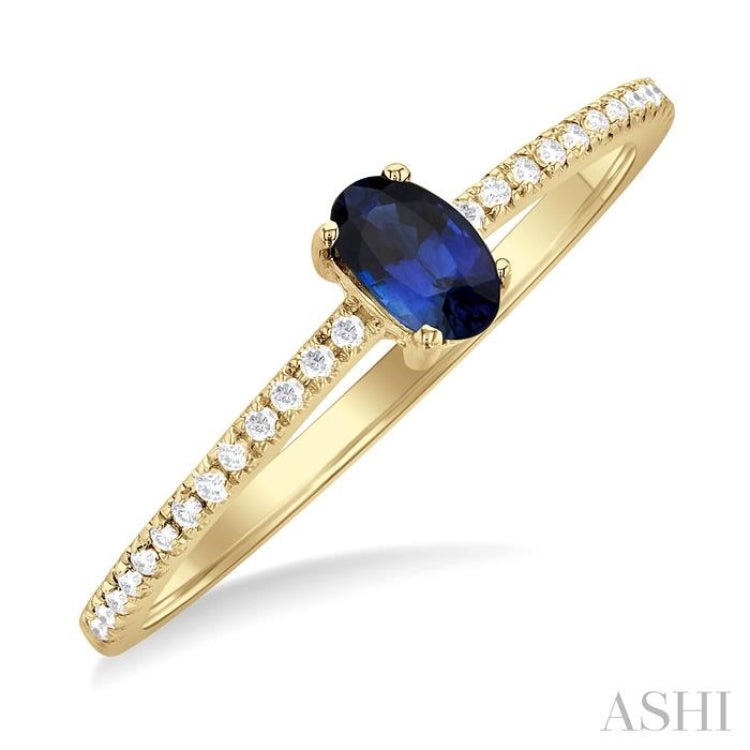 A sleek and elegant precious gemstone fAshion ring, this makes a fine addition to the jewelry case. Its delicate design and pretty layout, true to the new and popular petite collection from where the ring hails, make it an instant attraction. The ring features a prong-raised 5X3 MM oval cut Sapphire center stone. 26 fishtail set round cut diamonds embellish the shank, 13 diamonds each on either side. The Petite precious fAshion ring is framed in a 10 karat yellow gold. Total diamond weight is 1/10 ctw.