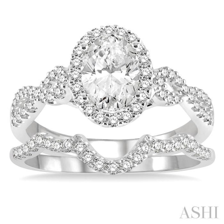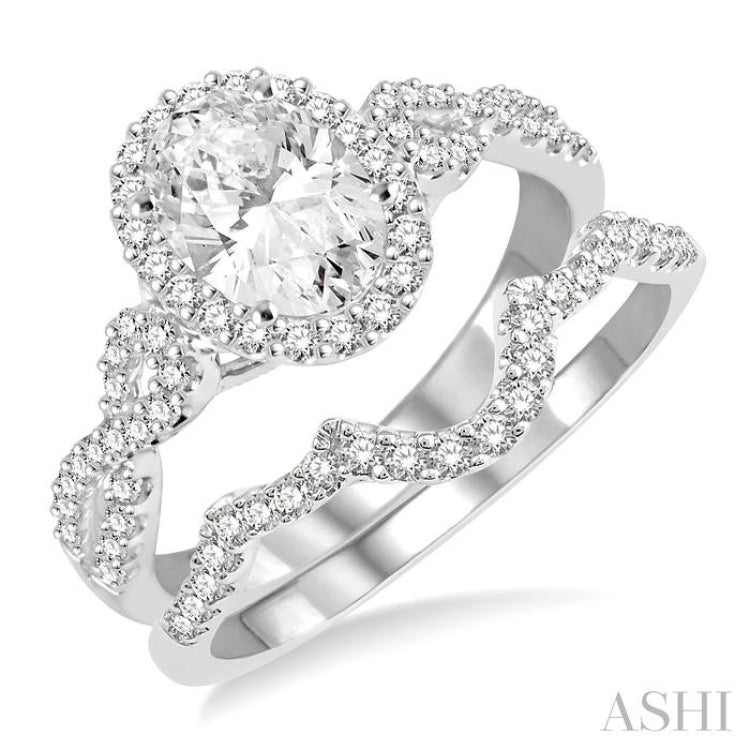 A majestic design and refined craftsmanship are the highlights of this mesmerizing wedding ring set. Its intricate workmanship and splendor can steal hearts without much ado. The magnificent engagement ring features a lustrous oval cut center stone, which is encircled by delicately set 16 round cut diamonds. 34 prong set round cut diamonds embellish the twisted 14 karat white gold shank. The dainty wedding band has a curvy structure and is encrusted with 23 prong set round cut diamonds.The wedding set is framed in 14 karat white gold. Total diamond weight is 3/4 ctw.