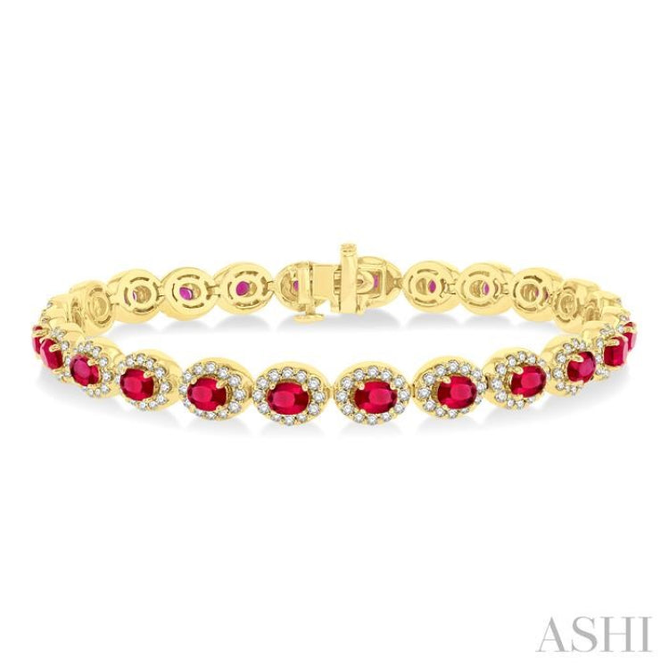 2 1/6 ctw Oval Cut 4X3 MM Ruby and Round Cut Diamond Halo Precious Tennis Bracelet in 14K Yellow Gold