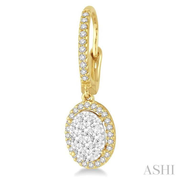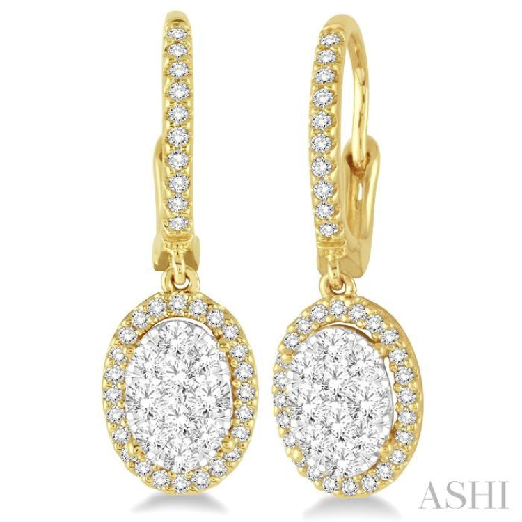 A fun and fanciful designed diamond lovebright earrings for her. Crafted in cool 14 karat yellow and white gold, these earring features a set of 20 invisible set round cut diamonds in oval shape bordered with a frame of dazzling 68 prong set round cut diamonds along with the front edge. These treats closes with a secure clasp. Total diamond weight is 2 ctw.