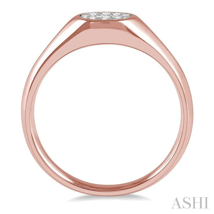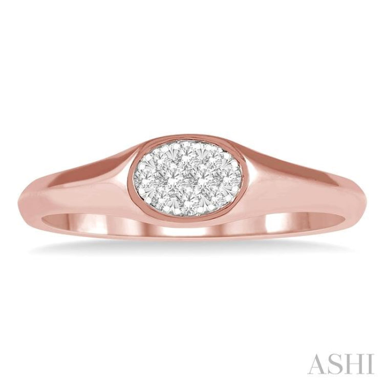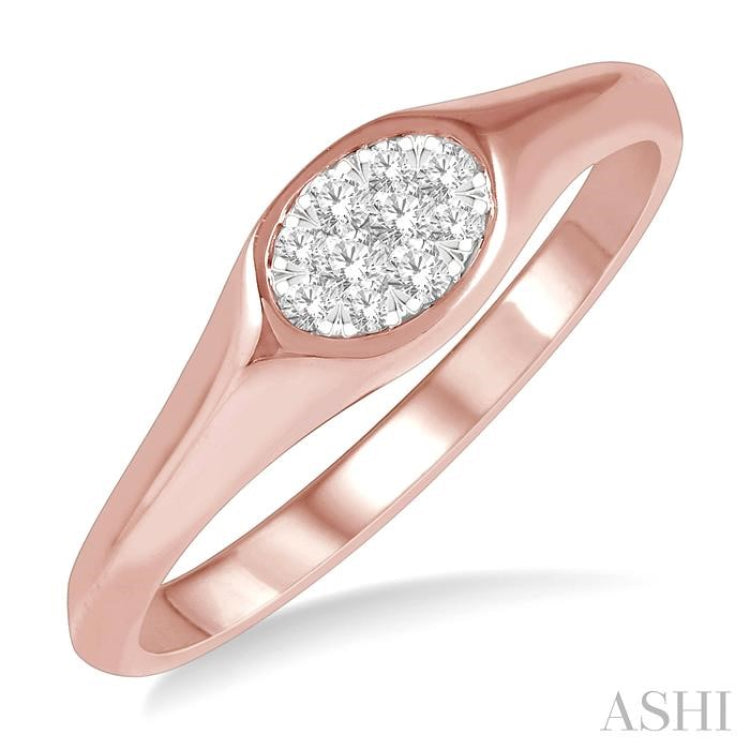 Simplicity does not make this diamond ring any less beautiful than the elaborate rings. In fact, as a Lovebright ring, it lives up to the grandness of the collection. The ring features an oval shape cavity in the center, built into the ring. Round cut diamonds fill this center in a closely fit cluster. There are a total of 10 invisible set round cut diamonds adorning the oval cavity. The rest of the ring is in smooth plain gold, and is styled in 14 karat rose and white gold. Total diamond weight is 1/8 ctw.