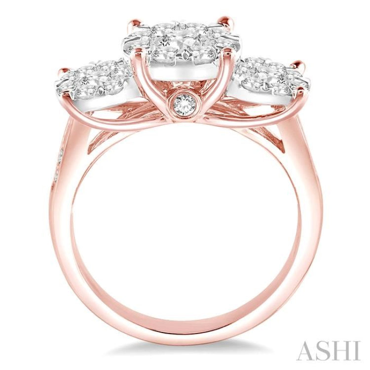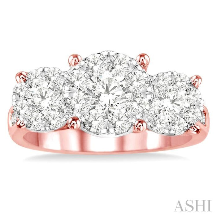This captivating Lovebright diamond ring will make your love more special for her. Beautifully crafted in cool 14 karat rose and white gold, this ring features a trios of framed round diamond arrays arranged side-by-side along the shank. Additional diamonds line the shank. 35 round cut diamonds are set in invisible and channel set. Total diamond weight is 2 Ctw.