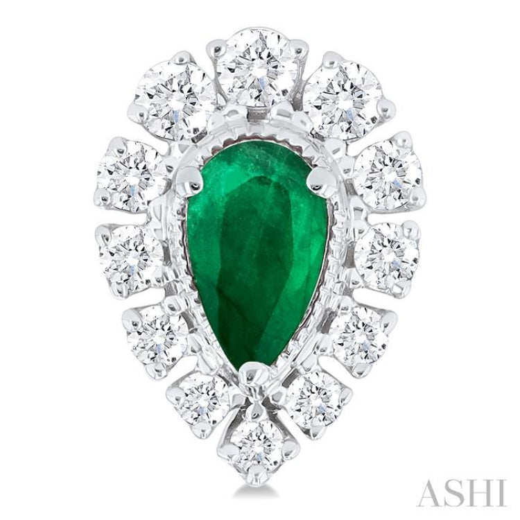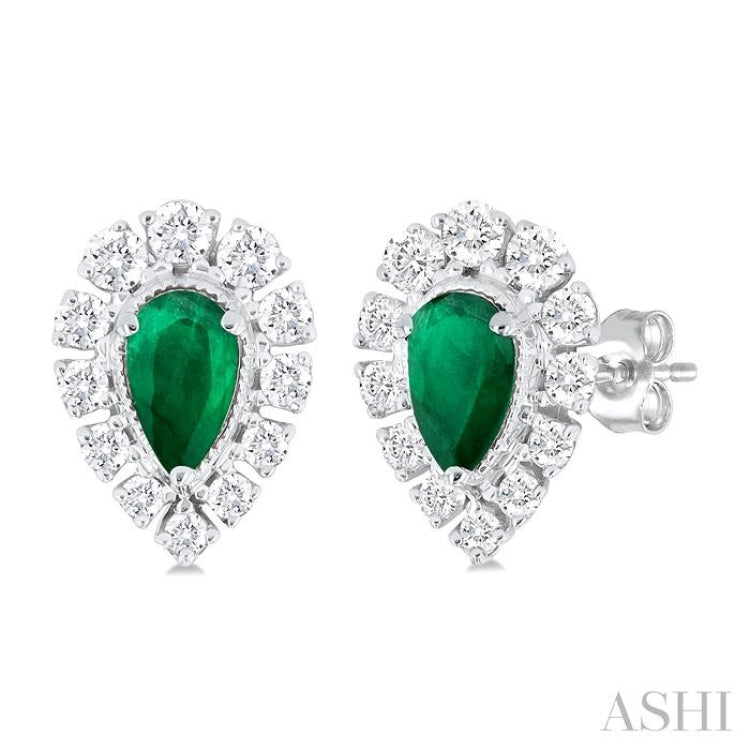 A gorgeous pair of precious stud earrings, these add sophistication to your look. The earrings feature a pear shape mount, embellished with a 5X3 MM pear cut Emerald center stone, total 2 on both earrings. The Emerald center stone is haloed by 12 each prong set round cut diamonds, total 24 on both earrings. A milgrain border is seen around the center stone. The precious stud earring is secured by a push-back earnut closure and is styled in a rhodium finish 14 karat white gold. Total diamond weight is 1/3 ctw.