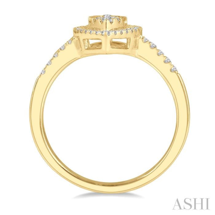 An attractively styled fusion diamond fAshion ring, this catches the eye instantly. It features a two-tiered pear shape center mount, decorated with diamonds. Embellishing the center top tier are 3 bezel set baguette cut diamonds running through the center. 3 each, total 6, split prong set round cut diamonds flank the baguette diamonds from the top and bottom. Adorning the lower tier are 25 split prong set round cut diamonds. Also, 5 each split prong set round cut diamonds accent the shank on either side, total 10 diamonds. The fusion diamond fAshion ring is crafted in 14 karat yellow gold. Total diamond weight is 3/8 ctw.