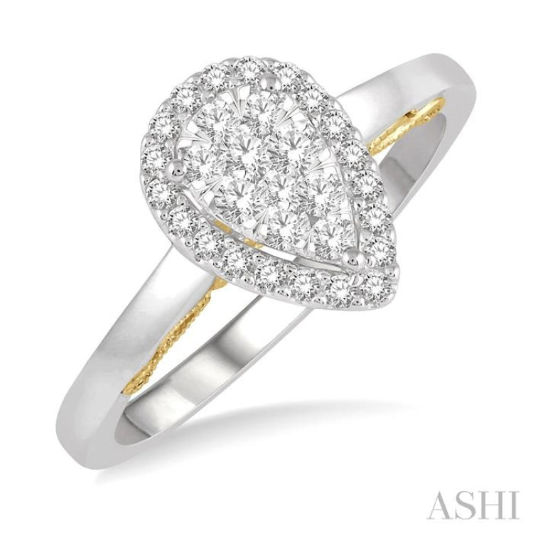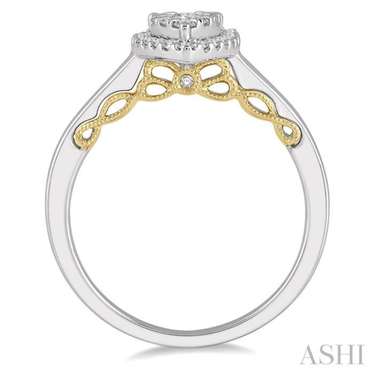 A captivating design meets the eye when you see this Lovebright diamond cluster ring. True to the Lovebright collection, the ring showcases glamour and visual appeal. It features a pear shape mount, with the pear shape centre embellished with 10 invisible set round cut diamonds. 20 prong set round cut diamonds line the lower pear shape part, bordering the top mount. Also seen is a yellow gold gallery, with a bezel set round cut diamond each encrusted in the centre, at the front and back. The ring is crafted in 14 karat white and yellow gold. Total diamond weight is 1/3 ctw.