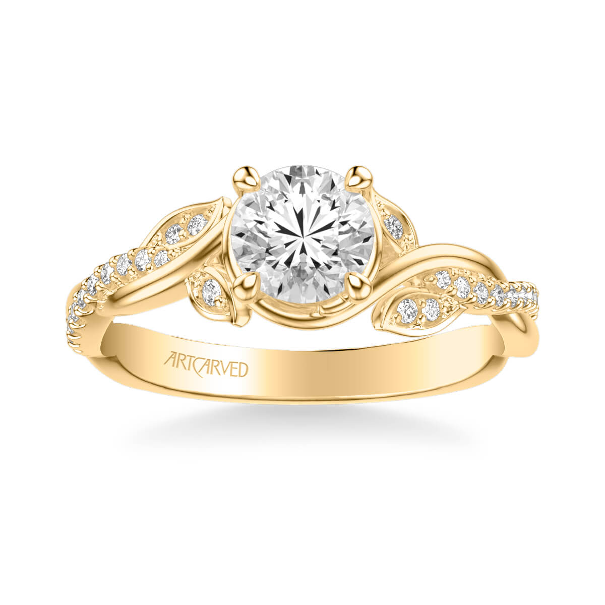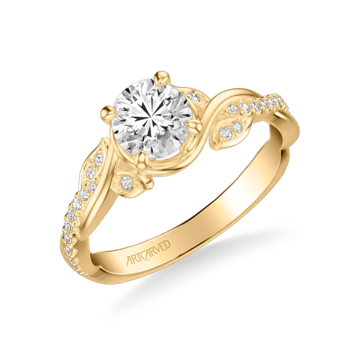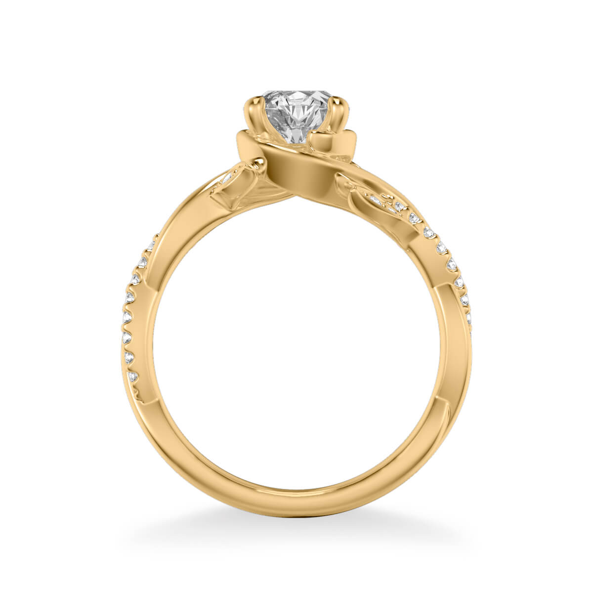 This Side Stone Diamond Engagement Ring is more beautiful than any flower. The unique wrap around basket surrounds the center stone and delicate diamond enhanced petal accents flourish with romance over the diamond and polished band.
