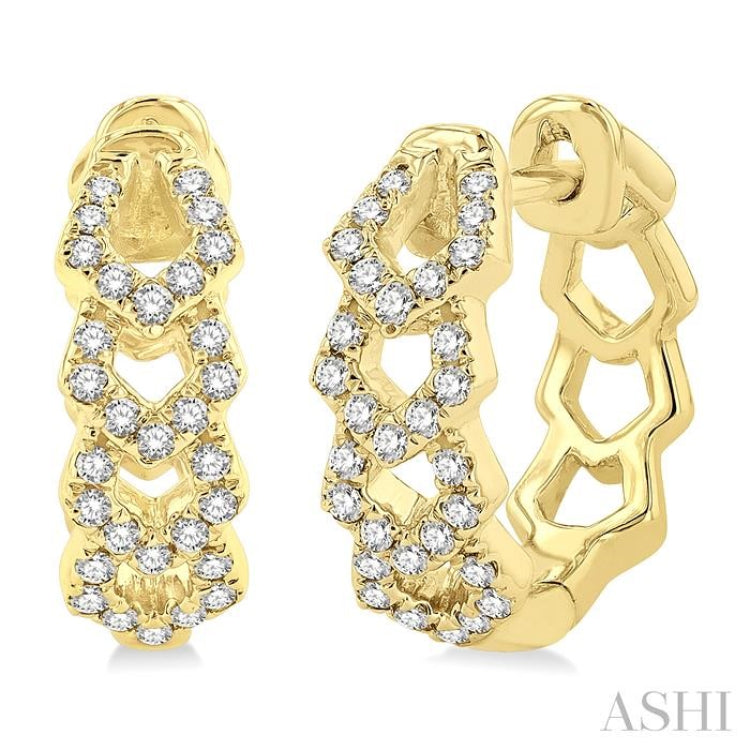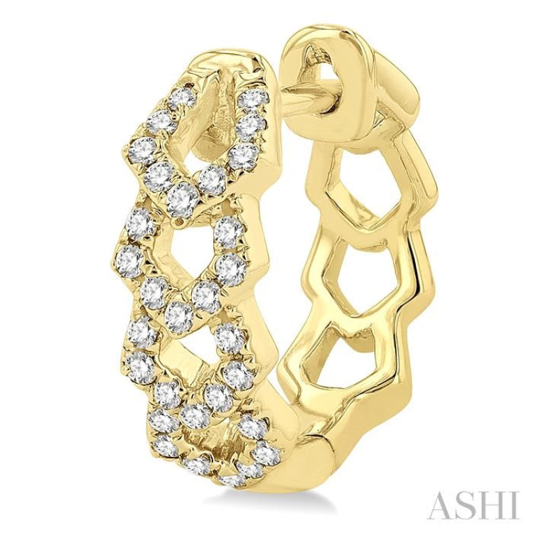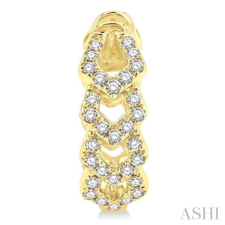 An exquisite pair of diamond fashion huggies, these captivate you with their eye-catching design. They also showcase the beauty of the petite Collection, giving reason to its popularity with buyers. The huggies feature a geometric link pattern all around the hoop, while round cut diamonds add glamour to them. 30 each, total 60, fishtail set round cut diamonds embellish the hoop front, while the back is plain gold. The petite diamond fashion huggies are framed in 10 karat yellow gold. Total diamond weight is 1/4 ctw.