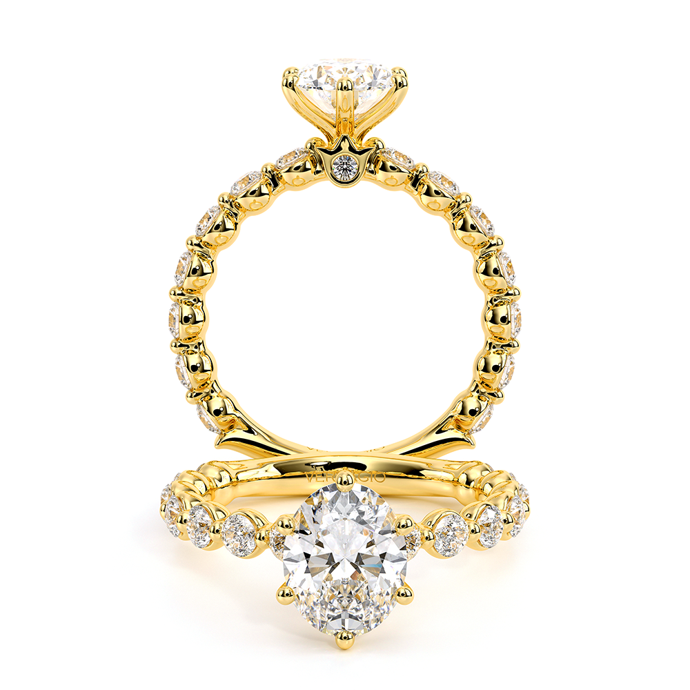 Renaissance-989OV-2.5 features a diamond-rich, four-prong setting meticulously crafted to cradle each stone securely. Its sleek, shared-prong cup setting exudes elegance, while the design ensures both comfort and durability. Verragio's signature crest unifies the sophisticated style.