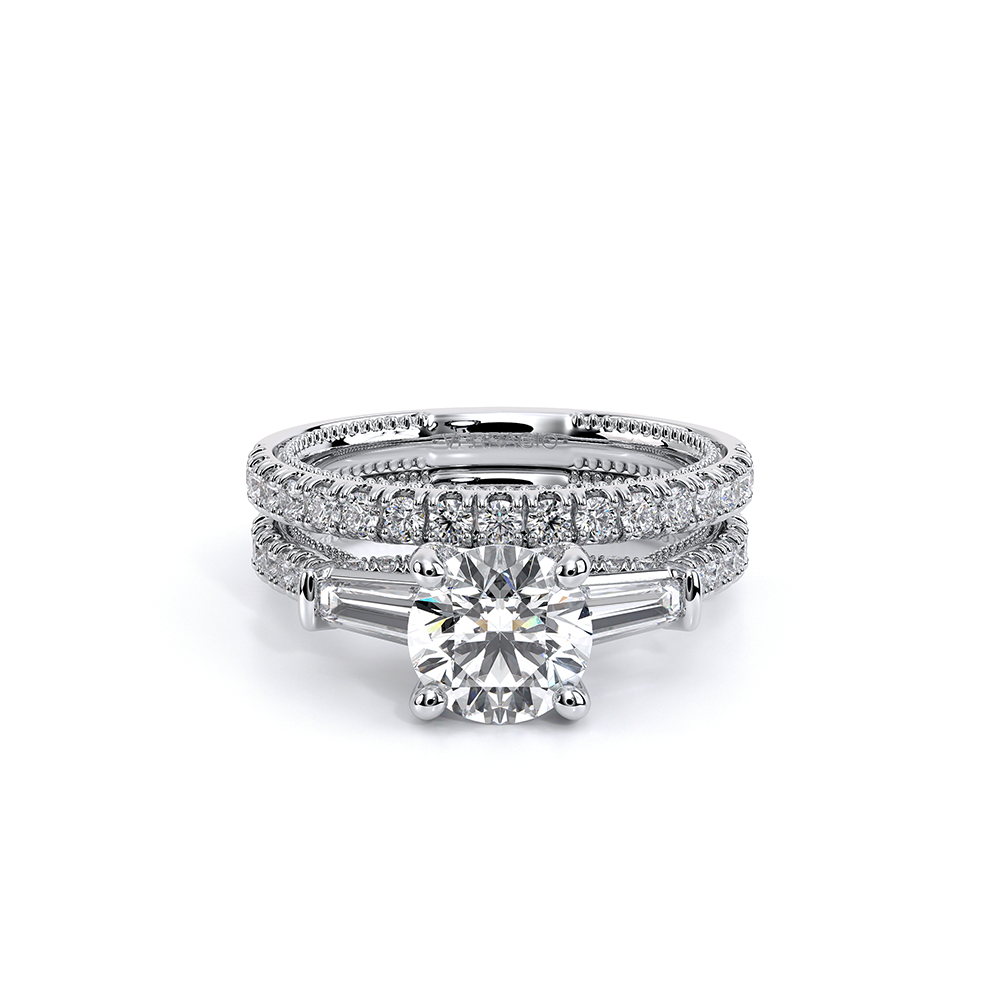 Renaissance-991R is a captivating three-stone engagement ring featuring baguette diamond side-stones. Pave diamonds beautifully frame your center stone; the diamond shank adorned with delicate milgrain detail elevates this ring with elegance. The Verragio signature crest completes the refinement of this piece.