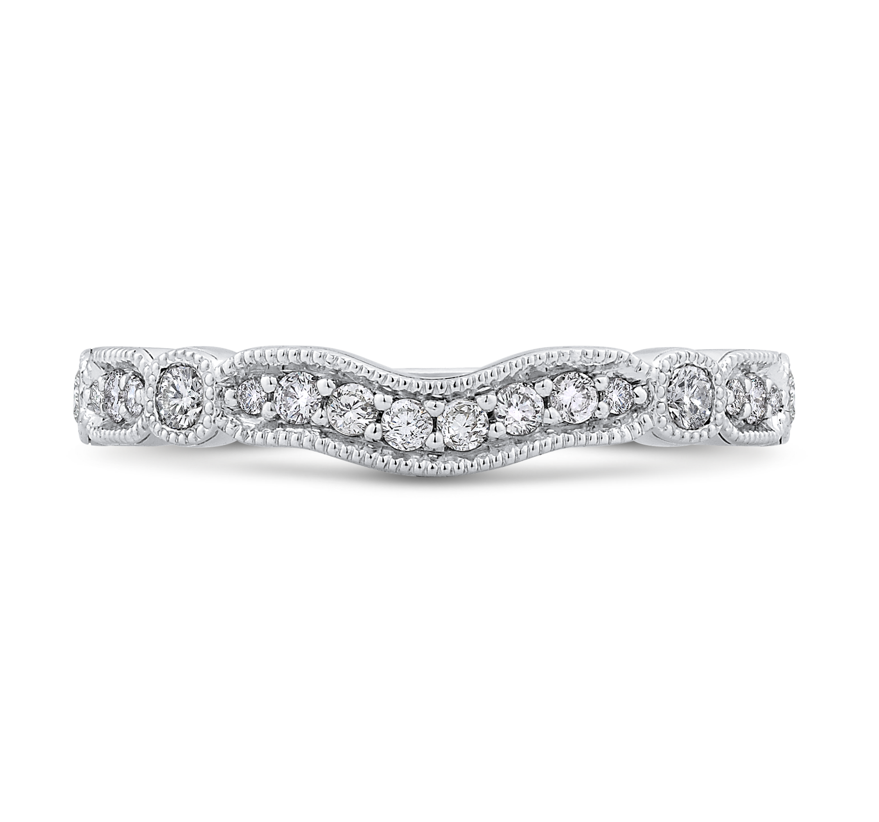 This exquisite half-eternity wedding band features a row of brilliant round diamonds set in a timeless 14K white gold band. The classic design and superior craftsmanship make this ring a perfect symbol of everlasting love and commitment. Elevate your special day with this elegant and sophisticated piece that will be cherished for a lifetime.
