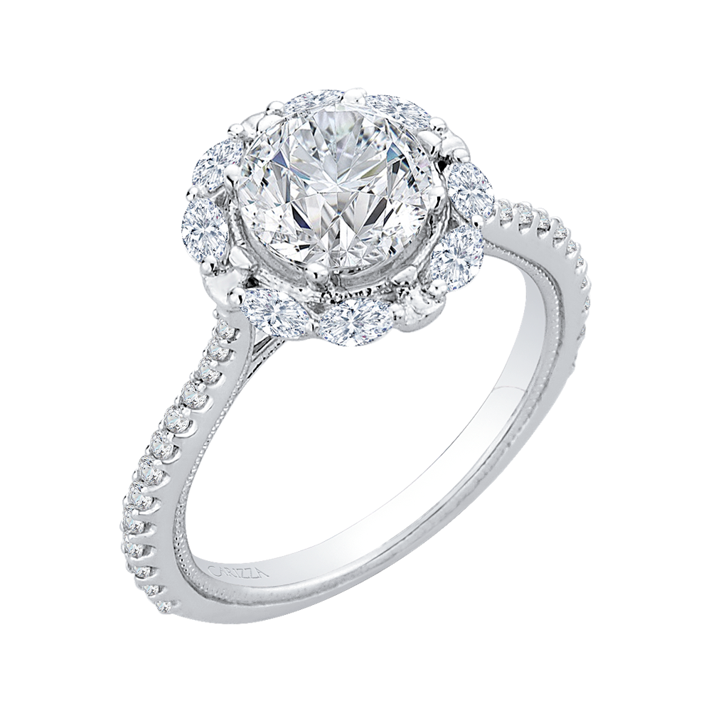 This exquisite round diamond halo engagement ring exudes timeless elegance and sophistication. Crafted in lustrous 14K white gold, the semi-mount setting allows you to choose the perfect center stone to complete this stunning piece. A symbol of everlasting love and commitment, this ring is sure to capture the heart of your beloved.