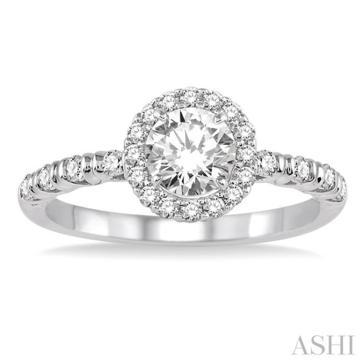 Get down on one knee and ask the woman you love to spend the rest of her life with you. Stunning in 14 karat white gold, this semi-mount engagement ring is embellished by sparkling 22 pave set round cut accented diamonds that forms a circle and flow down the shank in a brilliant row. The crown of this ring is designed to frame your choice of round center stone ranging from 0.20 carat to 0.30 carat. Total diamond weight is 1/4 ctw.