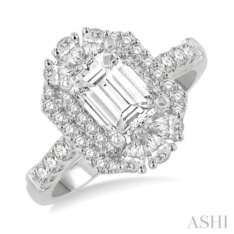 A magnificent semi-mount diamond engagement ring, this makes for a sure stunner. It features a raised octagonal shape center mount, with a 14 karat white gold prong raised center border. This is where, as a semi-mount ring, a center stone of your choice gets installed. An emerald cut center stone, between 0.85 ctw to 1.20 ctw can fit here. The lower octagonal border is glamorously decorated with 3 each fancy set pear cut diamonds at the top and bottom, while 2 rows of round cut diamonds run parallel from the top pear cut stone to the one at the bottom. 6 each, total 12, prong set round cut diamonds accent the inner row, whereas the outer row is adorned with 8 each, total 16, prong set round cut diamonds. 3 each prong set round cut diamonds embellish the shank on either side, with a twin line carving, offering a bordered look with milgrain finish. The ring is styled in 14 karat white gold. Total diamond weight is 5/8 ctw.