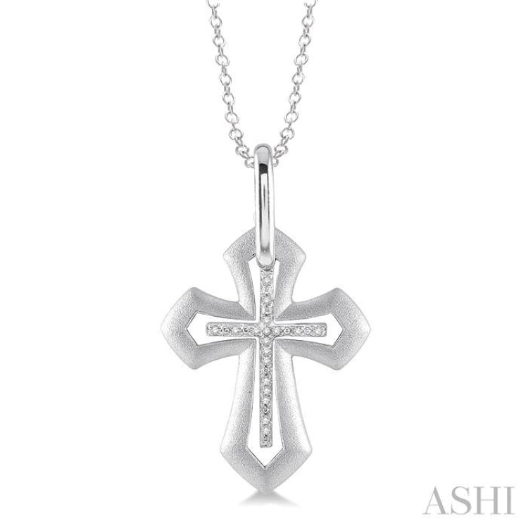 Symbolize your power expression of religious devotion with this magnificent diamond cross pendant. Styled in gleaming sterling silver this pendant is adorned with 18 radiant prong set single cut diamonds arranged around the cross. It dangles from a elegant Cable chain. Total diamond weight is 1/20 ctw.
