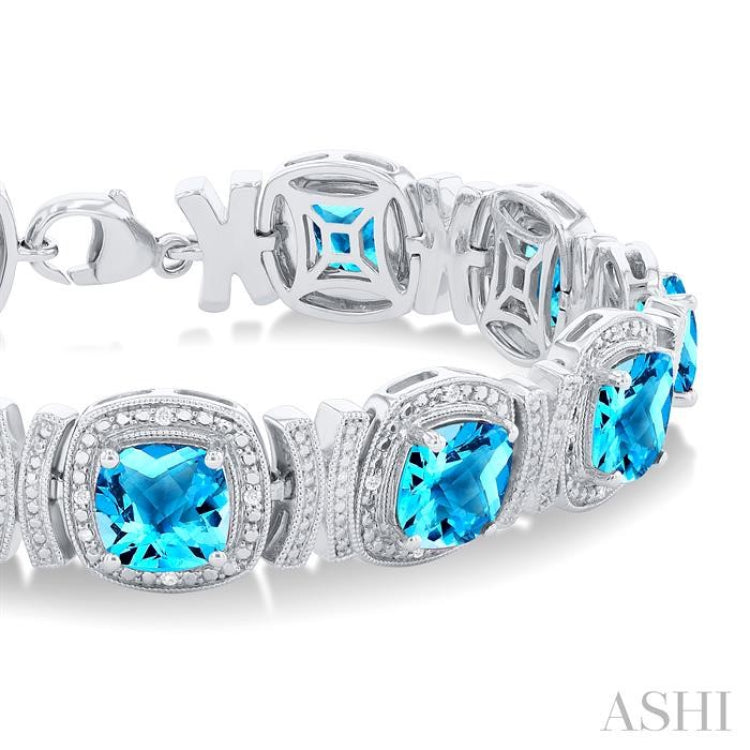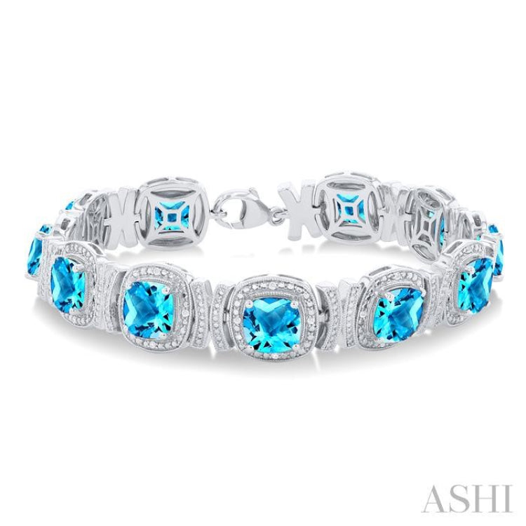 An impressive semi-precious bracelet, this offers visual appeal. The rich Blue Topazs lends an elegant touch to this well-crafted bracelet. It features a link of 11 cushion shape mounts, with side arches on each mount, connecting the mounts to each other. A cushion cut 7X7 MM Blue Topaz each, total 11, adorns each of the mounts. 28 pave set round cut diamonds and a milgrain finish are also visible on the bracelet. A lobster clasp secures the semi-precious bracelet, which is styled in a rhodium finish sterling silver. Total diamond weight is 1/10 ctw.
