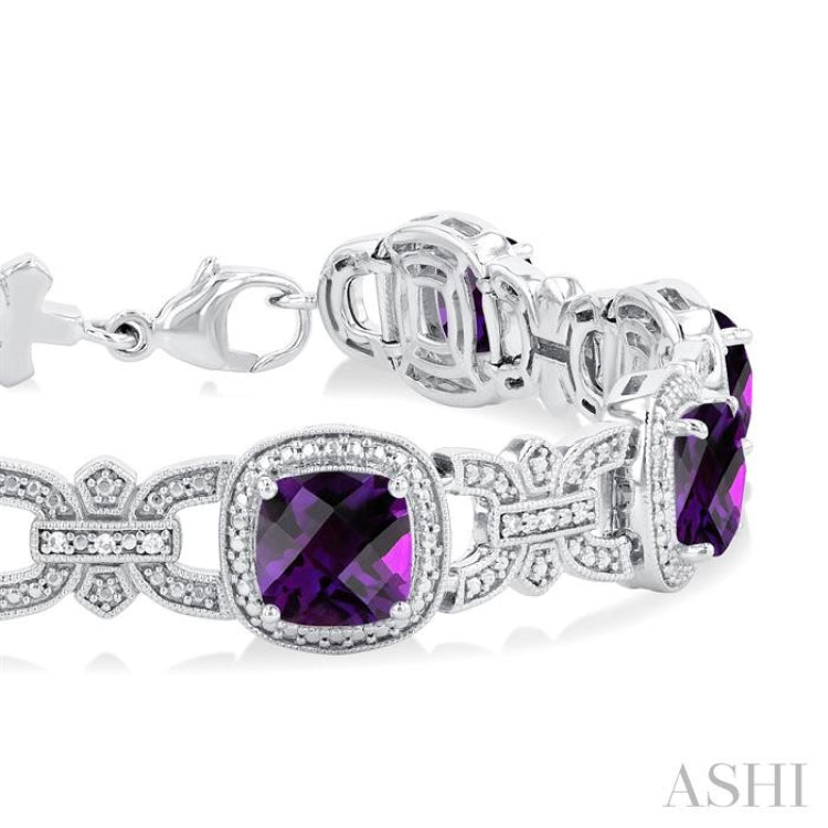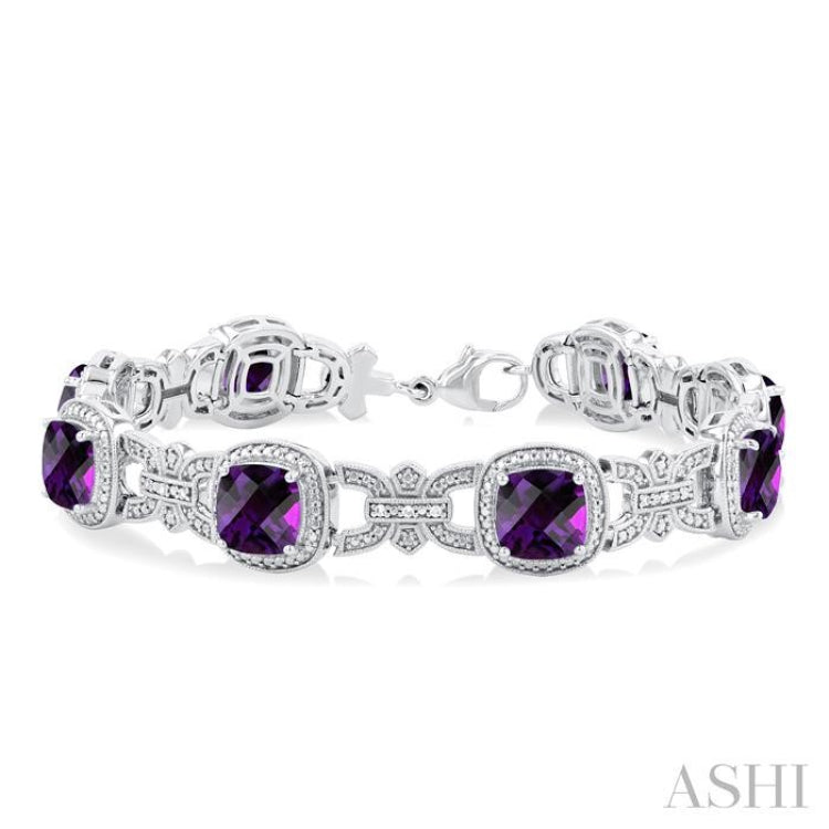 An eye-catching semi-precious bracelet, this offers a stylish and showy look. It features 8 cushion-shaped mounts, linked via inverted C-shape links. Each of the cushion mounts is embellished with a 7X7 MM cushion cut Amethyst center stone, total 8, haloed by a double milgrain border, with a beaded finish between the milgrain borders. The C-shape links are joined together by a center bar link, which is adorned with 3 each pave set round cut diamonds, total 24 on all links together. A milgrain finish is seen on all the links. A lobster clasp holds the semi-precious bracelet, which is styled in rhodium finish sterling silver. Total diamond weight is 1/10 ctw.