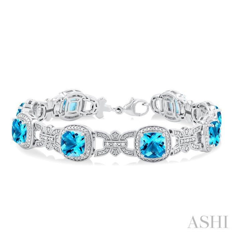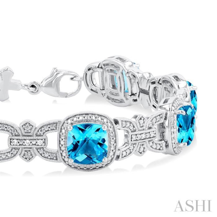 An eye-catching semi-precious bracelet, this offers a stylish and showy look. It features 8 cushion-shaped mounts, linked via inverted C-shape links. Each of the cushion mounts is embellished with a 7X7 MM cushion cut Blue Topaz center stone, total 8, haloed by a double milgrain border, with a beaded finish between the milgrain borders. The C-shape links are joined together by a center bar link, which is adorned with 3 each pave set round cut diamonds, total 24 on all links together. A milgrain finish is seen on all the links. A lobster clasp holds the semi-precious bracelet, which is styled in rhodium finish sterling silver. Total diamond weight is 1/10 ctw.