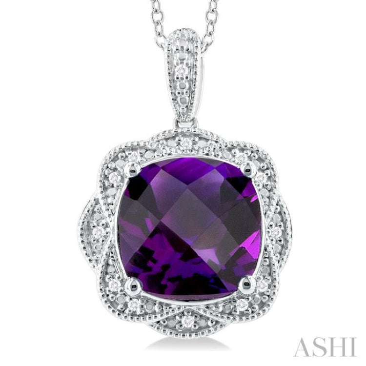1/20 ctw Cushion Cut 10X10 MM Amethyst and Round Cut Diamond Semi Precious Pendant With Chain in Sterling Silver