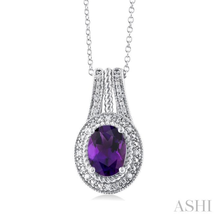 An alluring Amethyst and diamond semi-precious pendant, this makes for a quick choice. Its vivid color and attractive design, catch the eye instantly. The pendant features an oval shape mount, suspended by two bar loops, with a rope bead bar in the center. An 8X6 MM oval cut Amethyst center stone, sits in the middle of the mount, haloed by a rope bead accent. Distantly placed 12 pave set round cut diamonds encircle the center stone, followed by a milgrain border. Milgrain is also seen on the engraved bar loops. A cable chain holds the semi-precious pendant, both of which are molded in a rhodium finish sterling silver. Total diamond weight is 1/20 ctw.