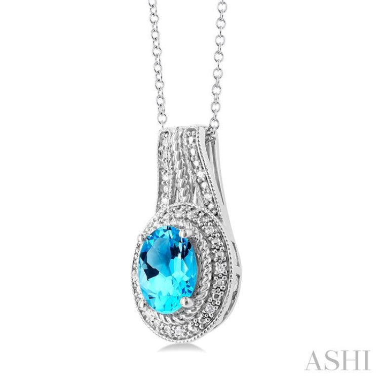 An alluring Blue Topaz and diamond semi-precious pendant, this makes for a quick choice. Its vivid color and attractive design, catch the eye instantly. The pendant features an oval shape mount, suspended by two bar loops, with a rope bead bar in the center. An 8X6 MM oval cut Blue Topaz center stone, sits in the middle of the mount, haloed by a rope bead accent. Distantly placed 12 pave set round cut diamonds encircle the center stone, followed by a milgrain border. Milgrain is also seen on the engraved bar loops. A cable chain holds the semi-precious pendant, both of which are molded in a rhodium finish sterling silver. Total diamond weight is 1/20 ctw.