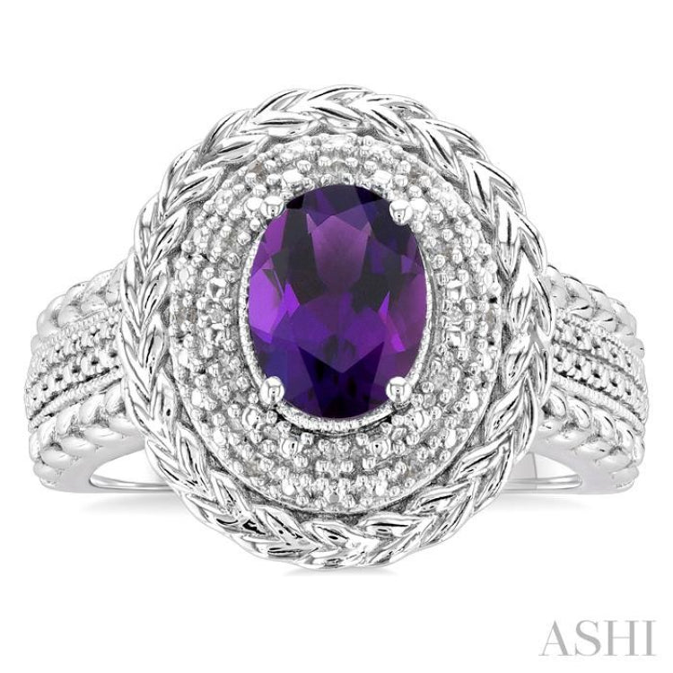 An attractive semi-precious Amethyst and diamond ring, this offers a well-designed, pretty look. It features an oval shape center mount, embellished with a 9X7MM oval cut Amethyst center stone. Four ball bead rows encircle the Amethyst, followed by a thick braided border. The shank is adorned with 6 each, total 12 on either side, pave set round cut diamonds that line the center. A thick braided border is also seen on the rims of the shank. A milgrain finish is visible around the center stone and flanking the diamonds on the shank. The semi-precious Amethyst and diamond ring is carved in a rhodium finish silver. Total diamond weight is 1/20 ctw.