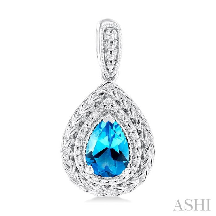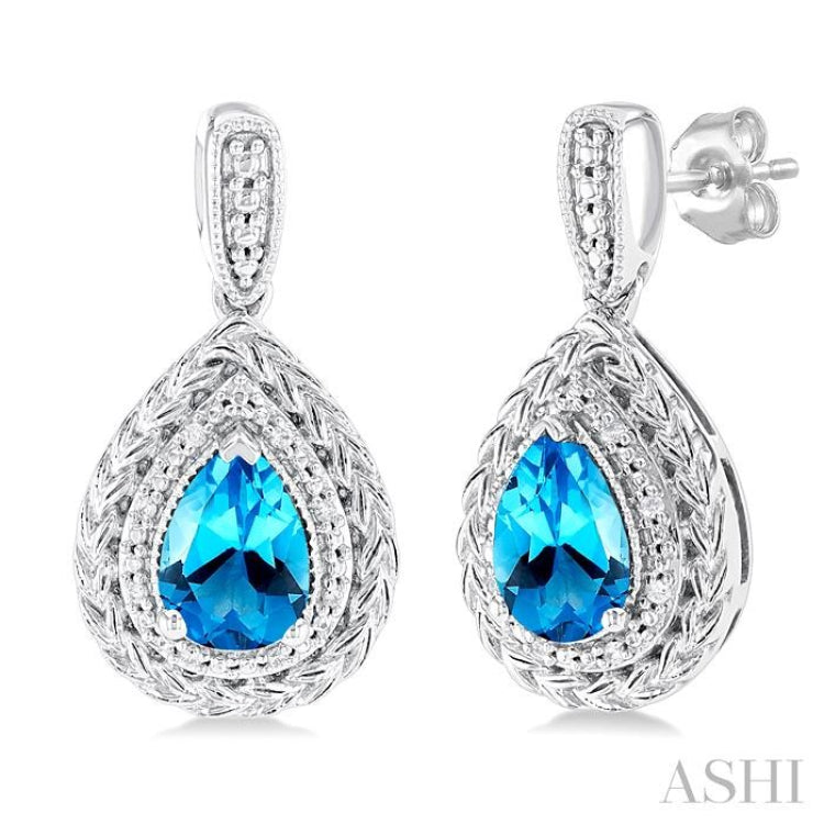 A vibrant pair of semi-precious earrings, these catch the eye with their beauty and appeal. The earrings feature a pear shape mount, suspended from a smaller pear shape mount that also holds the push-back earnut closure. Embellishing the large pear mount is a 7X5MM pear cut Blue Topaz center stone each, total 2 on the earring pair. 8 each, total 16, prong set round cut diamonds surround the center stone. A braided carving can be seen bordering the pear mount. Also seen is a milgrain finish around the Blue Topaz and the small pear mount at the top. The semi-precious earring is styled in rhodium finish sterling silver. Total diamond weight is 1/20 ctw.
