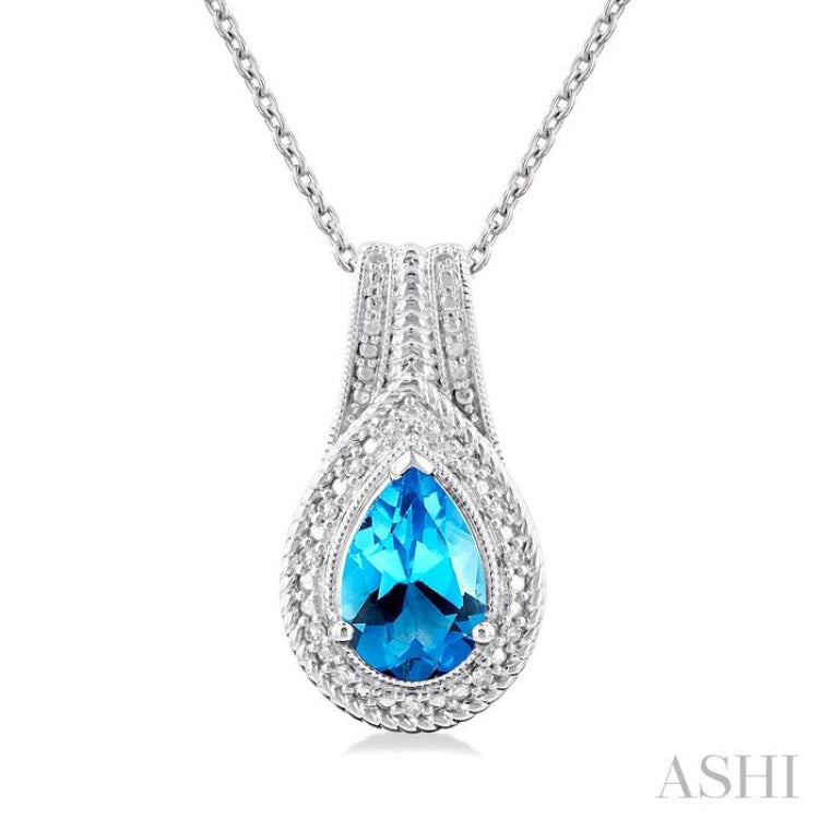 A smart and well-designed Blue Topaz and diamond semi-precious pendant, this adds a stylish look to different outfits. It features a pear shape mount, attached to a waterfall-shape loop chain holder, extending from the back of the pear mount. A 9X6 MM pear cut Blue Topaz center stone, embellishes the pear cut mount. Surrounding the center stone is a milgrain border, followed by 12 pave set round cut diamonds that are placed at certain intervals, and finished with a rope bead halo. The waterfall shaped loop holder is also accented with ball bead and rope bead carvings, and a milgrain finish. A cable chain carries the semi-precious pendant, both of which are crafted in a rhodium finish sterling silver. Total diamond weight is 1/20 ctw.