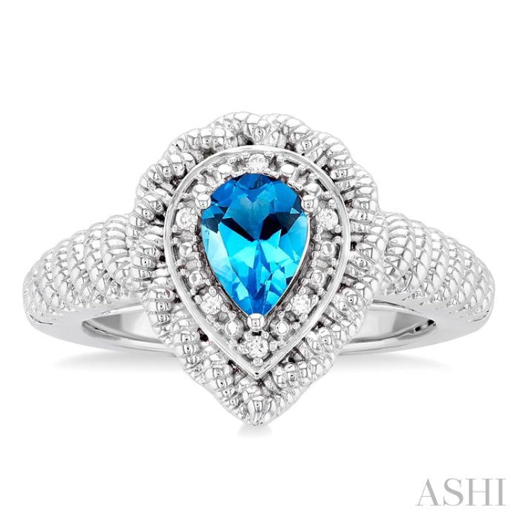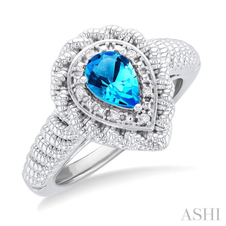 A distinctive semi-precious ring, this catches the eye with its alluring layout. It features a pear shaped center mount, embellished with a 7X5MM pear cut Blue Topaz center stone. Surrounding the center stone is 6 prong set round cut diamonds, bordered by a plain gold boundary around it. Following the plain gold border is a twisted rope accent that is also visible on either side of the shank. The semi-precious Blue Topaz and diamond ring is fAshioned in a rhodium finish sterling silver. Total diamond weight is 1/20 ctw.